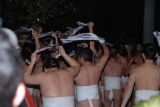 | ●婿押し祭り 春日神社の祭礼中最大の行事がこの婿(むこ)押し祭り。別名を「若水祭」ともいう。 全国的にも非常に珍しい行事で、平成7年には国指定重要無形民俗文化財に指定された。 前年中に結婚した新郎新婦を祝福する行事で、1月14日夜、45歳以下の氏子で組織された 「三期組合」の人たちが中心となって行われている。 行事の流れは、午後7時15分の左義長(さぎちょう)への点火の後に、子どもたちによる 樽(たる)の奪い合いが始まる。 続いて、花婿あいさつ、花嫁と花婿の盃など一連の「宿の行事」が行われる。 その後、花婿を含む氏子たちは裸になって神宮の前でおはらいを受け、神池(みいけ)を 舞台に祭りのハイライトである勇壮な「樽せり」に突入する。 もみ合ううちに割られた樽の一片を手にした者は、これを神棚に供え、 五穀豊饒(ごこくほうじょう)と開運を祈願する。 樽せりの後は春日川(牛頸(うしくび)川)へお汐井(おしおい)取りに行き、その帰る足で いっせいに拝殿に駆け上がって参拝し、花婿を中心に祝唄を唱和しながら、まるで “おしくらまんじゅう”のように拝殿の中でもみ合う。 その後一団は、左義長周辺へと駆け戻り、最後は神前に供えた「若水」を花婿に注ぎ 祝福する。 婿押しが終わると左義長の周りに集まり、手打ちをして一連の行事が終了する。 その起源がはっきりしないほど古くから繰り返されてきたこの祭りは、現在の春日市に なくてはならない祭りになっている。 毎年、参道にはたくさんの夜店が並び、老若男女が大勢詰めかけて春日神社は ときならぬ熱気に包まれる。 簡略化されたとはいえ、これだけの歴史を持つ祭りが、いまだに綿々と続き定着している 事実には驚かざるを得ない。 [主な行事の流れ] 1.左義長(さぎちょう) 2.子どもの樽取り 3.宿の行事 式次第は、 1開会の辞、 2三期組合代表者あいさつ、 3氏子総代あいさつ、 4区長祝辞、 5花婿あいさつ、 6花嫁熨斗出し、 7前酒、 8婿と婿抱きの盃 からなる。 4.樽せり 8時30分ごろ 5.お汐井取り 6.婿押し(拝殿もみ) 7.千秋楽 [日時] 1月14日 午後7時15分〜9時30分ごろ [場所] 春日神社(春日市春日1―110) |