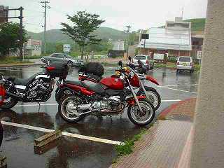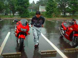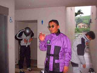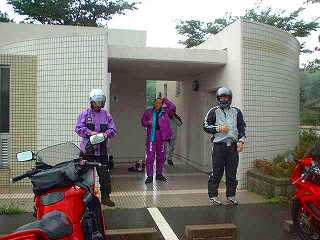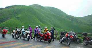 再出発。少し行くと見晴らしのよい展望所があり、記念撮影。宮崎からはるばる参加のR1100GS氏に景色を誉めていただくが、あいにくの雨で本当のカルスト台はよく見えていない。まあ、この方だったらいつでも来る。また来ましょうね。