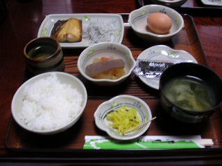 | 5月23日(日) 明け方4:00ごろになぜか目覚ましの音色、外は暗いぞ(-_-;) みな就寝が早かったせいか6:00には爽やかに起床 せっかくだから朝市に行ってみようとフロントに訪ねたら、 こんな時間にあいてないと迷惑そうなご主人の返答。 仕方がないからゆっくりして、身支度してすぐ出発できるよう 荷物などを下ろし、朝食を待つ。 |