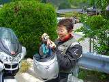 | 17:17 本日の宿、アウトライダー誌お勧めの「川床屋さん」に到着。 この少し前、(エドはるみ風でどうぞ→)「ちょっとしたハプニングぅ〜♪」 ※ハプニングとは:宿を探して大山寺近辺をぐるぐる中に、右下がりの坂道でUターン。 と、大人が前ブレーキかけちゃって、「あぁ〜〜〜ダメ〜〜〜〜、コテン。。。」 |