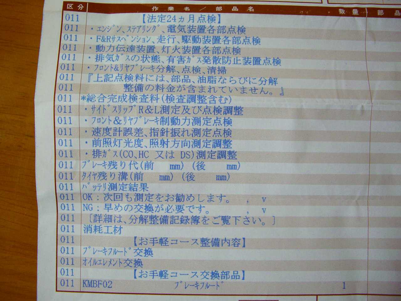車検の見積書2枚目(右側は、作業名/部品名) ※ともにクリックで拡大(1,280×965)